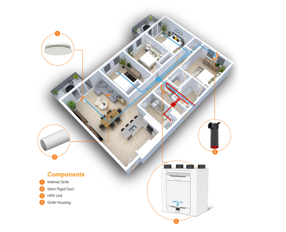 The unit recovers thermal energy from the inside air being exhausted to outside. The exhausted air then preheats or precools the incoming fresh air to create a more comfortable living space. The innovative Aerofresh 300 unit reduces moisture within the home to lower condensation and therefore minimise the risk of mould growth.
